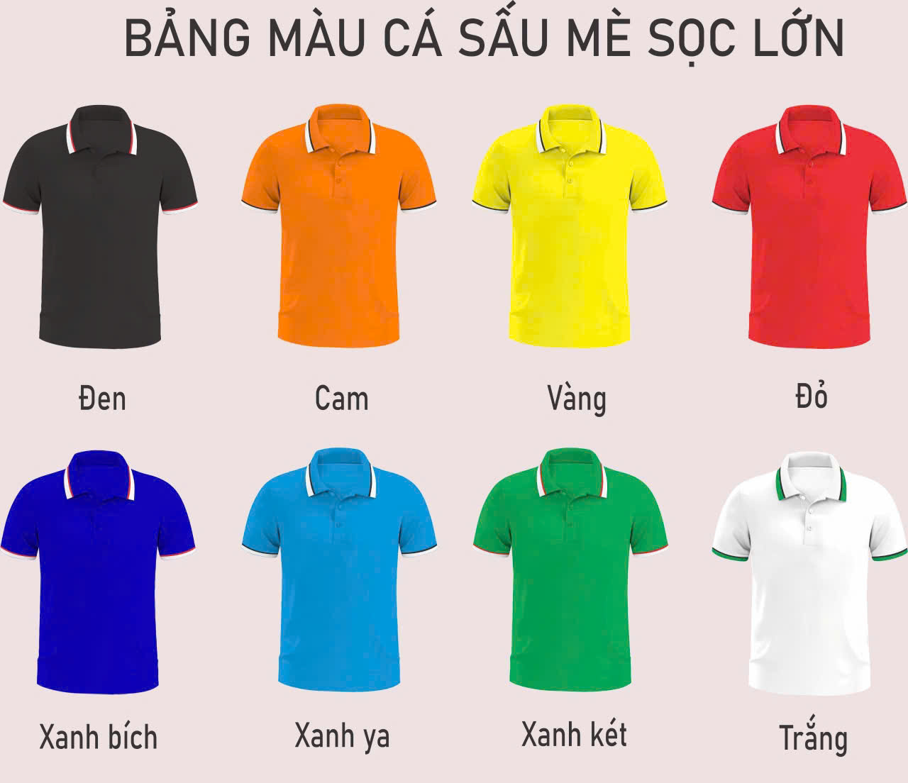 • Áo Polo cá sấu mè trơn: Thiết kế đơn giản với các màu sắc cơ bản như xanh ya, trắng, đen, đỏ.